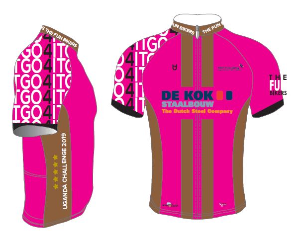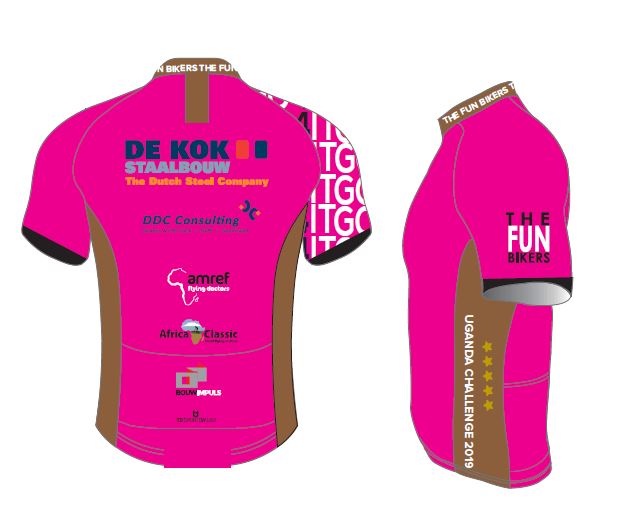 Samen met Martin Botter en Ferdy van de Werf vorm ik voor deze gelegenheid het team The Fun Bikers. En speciaal voor deze gelegenheid heeft Ellen een team-kit (wielershirt met bijpassende broek) ontworpen. Met deze kleding zetten we de hoofdsponsors in het zonnetje. Mooi roze is niet lelijk… Om al vast een beeld te krijgen hoe het team-kit eruit ziet hebben we deze toegevoegd. Vanuit het kleurrijke Uganda zullen we zeker een foto maken van het hele team met de sponsorkleding aan.