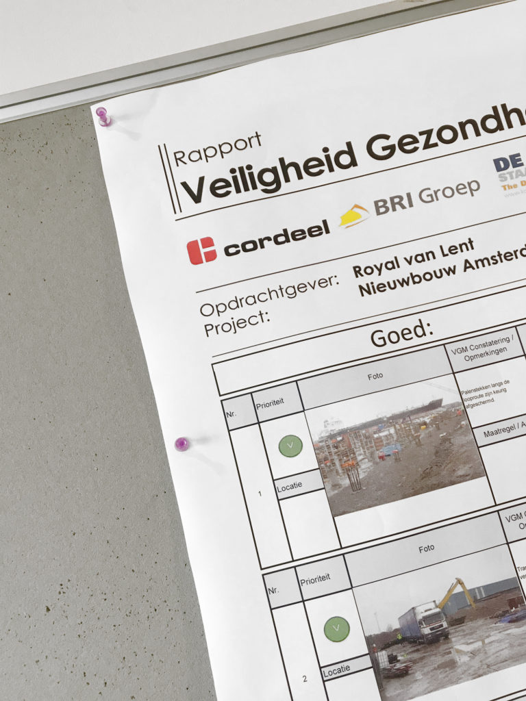 Bij de Nieuwbouw van Royal van Lent in Amsterdam Westpoort heeft Royal van Lent ons gevraagd om iedere week een bouwplaatsinspectie uit te voeren en deze wekelijks aan alle aannemers te rapporteren. Dit doen we middels een overzichtelijk rapport en Royal van Lent maakt hiervan iedere week een veiligheidsposter. Op deze poster staan naast de foutieve onderdelen ook de zaken die goed geregeld en veilig zijn.