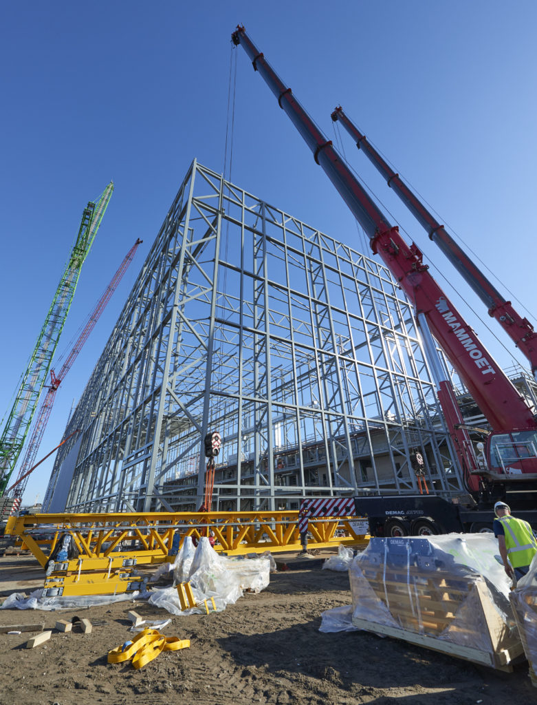 In de strakke planning waren er slechts enkele dagen beschikbaar voor de montage. Een erg klein ‘timewindow’ waarin er van alles kan misgaan. Zonder zij- en kopgevel was het pand nog niet stabiel genoeg en met het dak erop kunnen de kranen niet geplaatst worden. De montagehoogte van ca. 37 meter is namelijk te hoog (en te zwaar) voor normale hoogwerkers. De enige mogelijkheid was dus montage voordat het dak erop ging. Hiervoor zijn twee 250 ton mobiele hijskranen ingezet, die de afzonderlijke kranen stuk voor stuk en van bovenaf het pand in lieten zakken. Deze zijn hierna gelijk afgemonteerd en aangesloten, zodat de staalbouwer direct weer verder kon met de bouw van de dakconstructie.